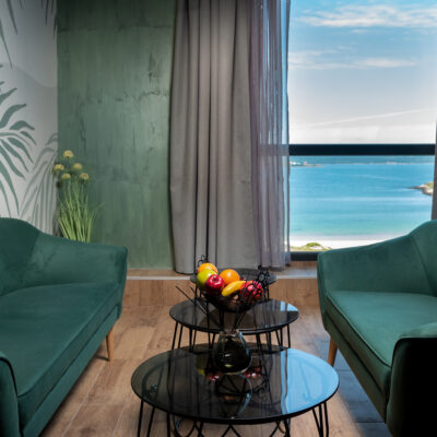 Гледката към морето от всеки апартамент е вълнуваща и оставя без думи. Няма нищо по-успокояващо от звука на вълните, докато отпивате сутрешното си кафе на балкона. Виждаме как гостите ни често споделят, че просто не могат да се наситят на този пейзаж.